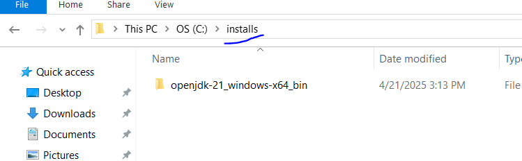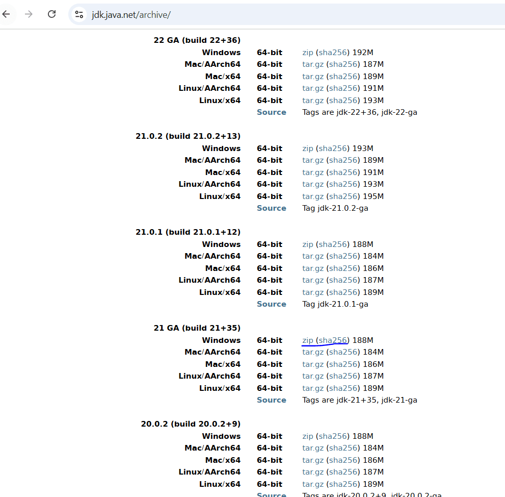 Download Java 21 Windows zip from https://jdk.java.net/archive/
