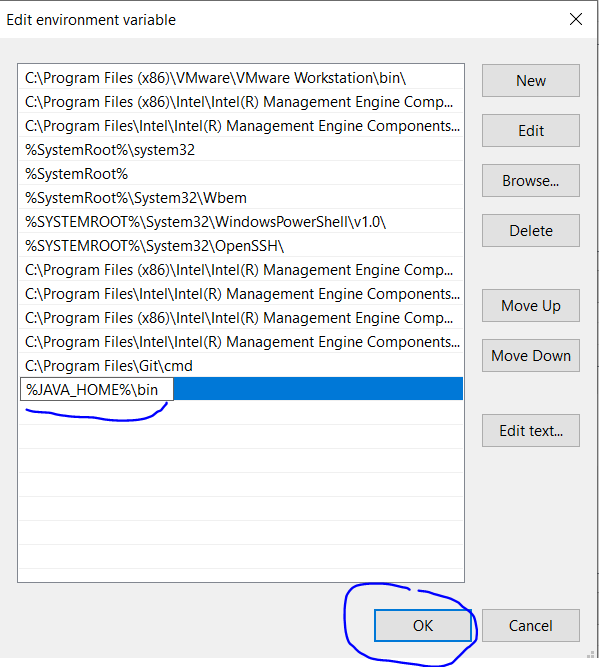 Enter “%JAVA_HOME%\bin” and click “Ok”